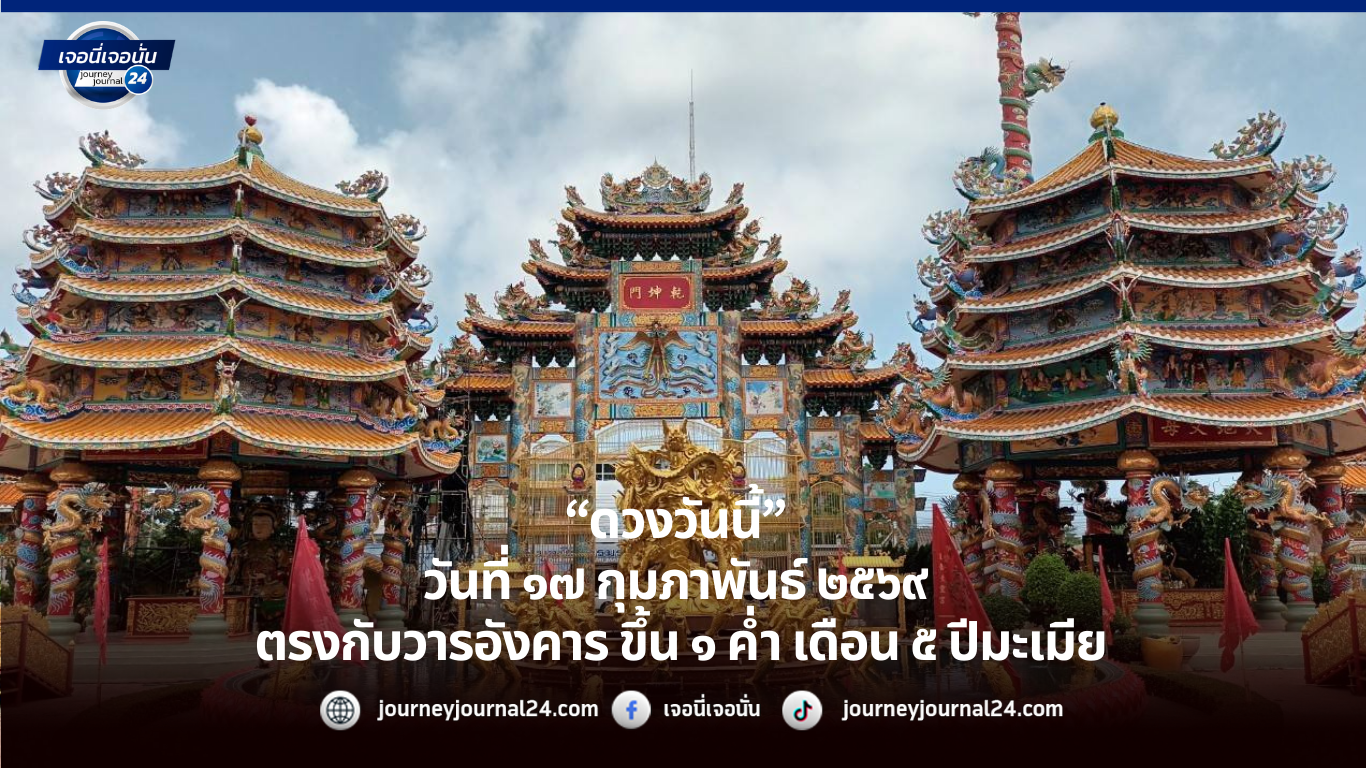วันที่ ๑๗ กุมภาพันธ์ ๒๕๖๙ ตรงกับวารอังคาร ขึ้น ๑ ค่ำ เดือน ๕ปีมะเมีย – หน่าจาซาไท้จื้อ คือ เทพเจ้าจีนผู้พิทักษ์ที่ขึ้นชื่อเรื่องความกล้าหาญและความอิทธิฤทธิ์สูงส่ง มีลักษณะเด่นคือ กุมารเหยียบล้อ ถือหอกและห่วงวิเศษ ช่วยในเรื่อ...