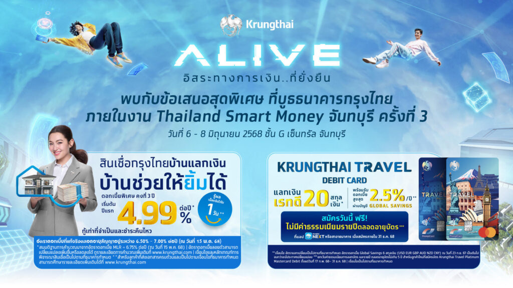 ภายในงาน ธนาคารสนับสนุนการสร้างความมั่นคงในชีวิตด้วย “สินเชื่อกรุงไทยบ้านแลกเงิน” ดอกเบี้ยพิเศษคงที่ 3 ปี เริ่มต้น 4.99% ต่อปี รับวงเงินสูงสุด 20 ล้านบาท ผ่อนนานสูงสุด 30 ปี (อัตราดอกเบี้ยที่แท้จริงตลอดอายุสัญญาอยู่ระหว่าง 6.50% – 7.00% ต่อปี) สินเชื่อที่อยู่อาศัย ทั้งบ้านใหม่ บ้านมือสอง ด้วยดอกเบี้ยพิเศษคงที่ 3 ปี เริ่มต้นปีแรก 2.29% ต่อปี (อัตราดอกเบี้ยที่แท้จริงตลอดอายุสัญญาอยู่ระหว่าง 5.13% – 5.17% ต่อปี) และ สินเชื่อบ้านรีไฟแนนซ์ ดอกเบี้ยพิเศษ คงที่ 3 ปี เริ่มต้น 1.99% ต่อปี วงเงินกู้สูงสุด 100% ของราคาประเมิน หรือไม่เกินยอดหนี้คงเหลือครั้งนี้ กู้ได้นานสูงสุด 40 ปี (อัตราดอกเบี้ยที่แท้จริงตลอดอายุสัญญาอยู่ระหว่าง 5.13% – 5.17% ต่อปี) และ สินเชื่อบ้านกู้ เพิ่ม (Top up) ดอกเบี้ยพิเศษคงที่ 3 ปี เริ่มต้น 7.09% ต่อปี (อัตราดอกเบี้ยที่แท้จริงตลอดอายุสัญญาอยู่ระหว่าง 7.25% – 7.59% ต่อปี) กู้เท่าที่จำเป็นและชำระคืนไหว สมมติฐานการคำนวณมาจากอัตราดอกเบี้ย MLR = 6.75% ต่อปี (ณ วันที่ 15 พ.ค. 68) อัตราดอกเบี้ยลอยตัวสามารถเปลี่ยนแปลงเพิ่มขึ้นหรือลดลงได้ รายละเอียดการคำนวณเพิ่มเติมดูที่ www.krungthai.com เงื่อนไขและหลักเกณฑ์การพิจารณาสินเชื่อเป็นไปตามที่ธนาคารกำหนด