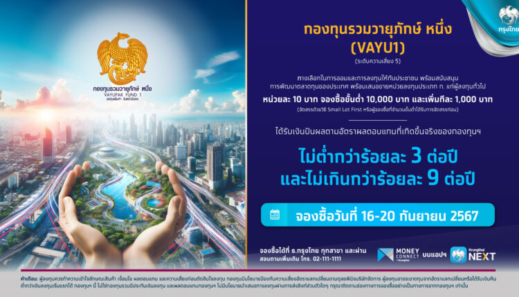 “กองทุนรวมวายุภักษ์ หนึ่ง” โอกาสรับผลตอบแทน 3-9% ต่อปี จองซื้อผ่าน Krungthai NEXT และสาขากรุงไทยทั่วประเทศ  16-20 ก.ย.นี้