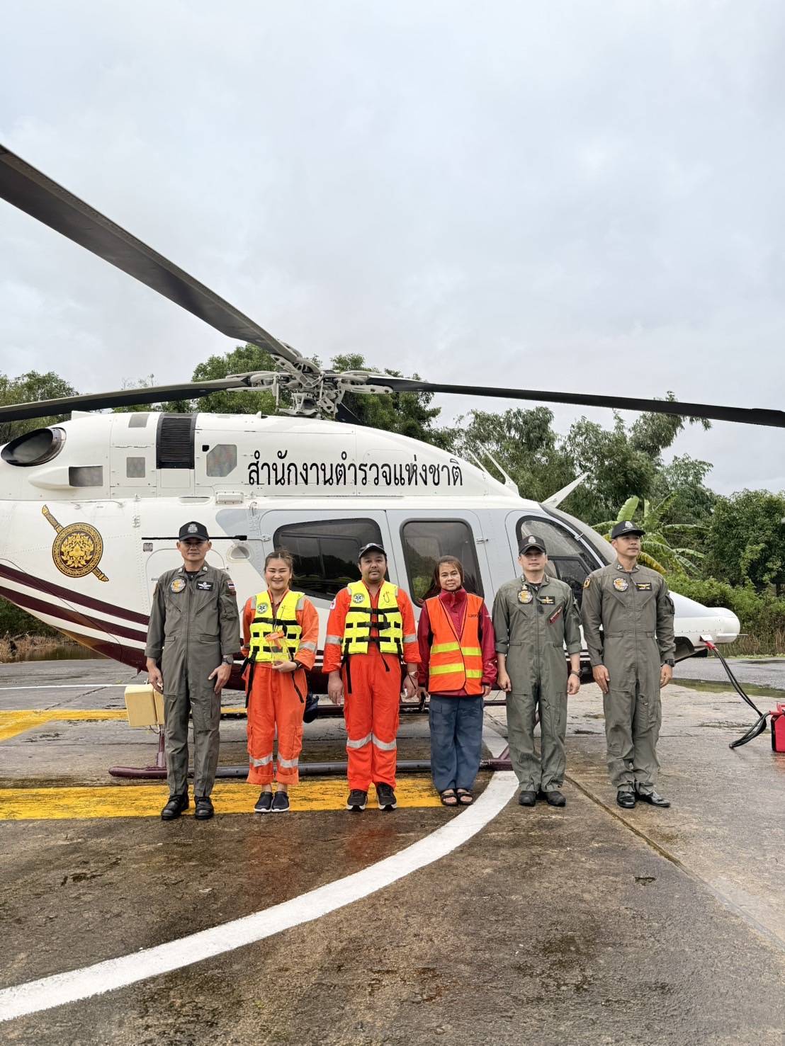 พล.ต.ท.ชัยต์พจน ระบุว่า ผบ.ตร.ได้สั่งการให้ หน่วยบินยะลา จัดกำลังอากาศยานสนับสนุนเร่งด่วน ประกอบด้วยเฮลิคอปเตอร์ แบบ ฮ.412 และ ฮ.429 จำนวนหลายเที่ยวบิน เพื่อตั้งฐานปฏิบัติการ (Base) ที่ หน่วยบินสงขลา ตำรวจตระเวนชายแดนภาค 4 ให้พร้อมทำการบินค้นหา ช่วยเหลือ และลำเลียงสิ่งของจำเป็นเข้าสู่พื้นที่ประสบภัยทันที