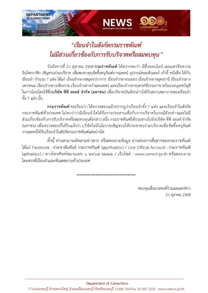 วันอังคารที่ 21 ตุลาคม 2568 กรมราชทัณฑ์ ได้ตรวจพบว่า มีสื่อออนไลน์ เผยแพร่ข้อความ อินโฟกราฟิก เชิญชวนร่วมบริจาค เพื่อสมทบทุนจัดซื้อครุภัณฑ์การแพทย์ อุปกรณ์คอมพิวเตอร์ เก้าอี้ หนังสือ ให้กับเรือนจำ จำนวน 7 แห่ง ได้แก่ เรือนจำกลางสมุทรปราการ เรือนจำกลางระยอง เรือนจำกลางอุดรธานี เรือนจำกลางนครพนม เรือนจำกลางเชียงราย เรือนจำกลางกำแพงเพชร และเรือนจำกลางนครศรีธรรมราช พร้อมระบุเลขบัญชี ในการโอนโดยใช้ชื่อบริษัท ซีพี ออลล์ จำกัด (มหาชน) เพื่อบริจาคเงินดังกล่าวให้กับสถานพยาบาลของเรือนจำ ทั้ง 7 แห่ง นั้น