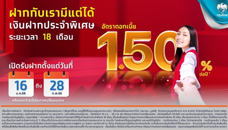 ธนาคารกรุงไทย ในฐานะธนาคารพาณิชย์ชั้นนำของประเทศ ตระหนักถึงความสำคัญในการออม   เพื่อยกระดับชีวิตความเป็นอยู่ของคนไทยให้ดีขึ้นทุกวัน รวมทั้งขับเคลื่อนการพัฒนาเศรษฐกิจและสังคมสู่ความยั่งยืน โดยมุ่งมั่นพัฒนาผลิตภัณฑ์และบริการทางการเงิน เพื่อตอบโจทย์ลูกค้าทุกกลุ่มในทุกมิติ  สอดคล้องกับวิสัยทัศน์  “กรุงไทย เคียงข้างไทย สู่ความยั่งยืน”  ล่าสุด ออกผลิตภัณฑ์  เงินฝากประจำพิเศษ 18 เดือน อัตราดอกเบี้ยคงที่เฉลี่ย 1.5% ต่อปี  จ่ายดอกเบี้ยทุกเดือน เพื่อสนับสนุนคนไทยมีวินัยในการออม เสริมสร้างความมั่นคงทางการเงินในอนาคต อีกทั้งช่วยเพิ่มรายได้ให้กับผู้ฝากเงิน ในภาวะที่ค่าครองชีพอยู่ในระดับสูง   นอกจากนี้ ยังเป็นการเพิ่มทางเลือกการออมและการลงทุนให้กับผู้ลงทุนที่ต้องการลงทุนในสินทรัพย์ที่มั่นคง ได้รับผลตอบแทนสม่ำเสมอ